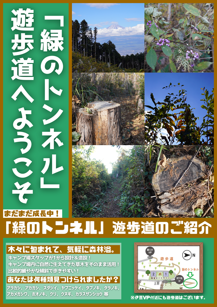 富士川キャンプ場内に遊歩道があることをご存知でしょうか。今夏は新たに「緑のトンネル」を造成しました(まだまだ成長中)。野田山で自然に育った樹木を生かしつつ、スタッフ一同、スコップやチェンソー・鋸などを使いながらイチから作りました。春夏秋冬で樹木たちの見せる表情は変わります。何度でも足をお運びいただけると、一生懸命遊歩道を作ったスタッフとして嬉しいです!